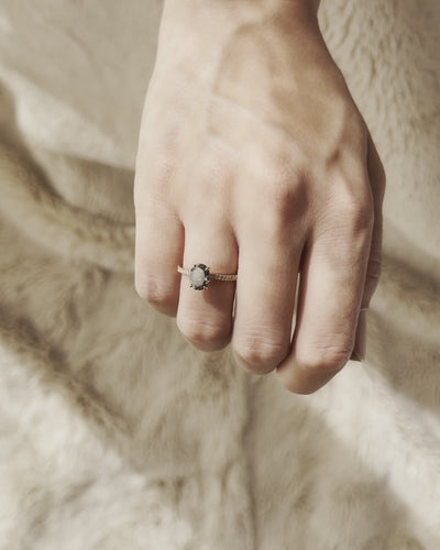 The Delphine ring features an oval-shaped, brilliant-cut salt and pepper diamond, exhibiting dark stormy gray and natural black hues. The center stone is complemented by 1mm accent white diamonds, all set in 18k rose gold. This design offers a unique take on the classic oval diamond ring. While crafted in rose gold, the Delphine can be customized in yellow or white gold upon request.