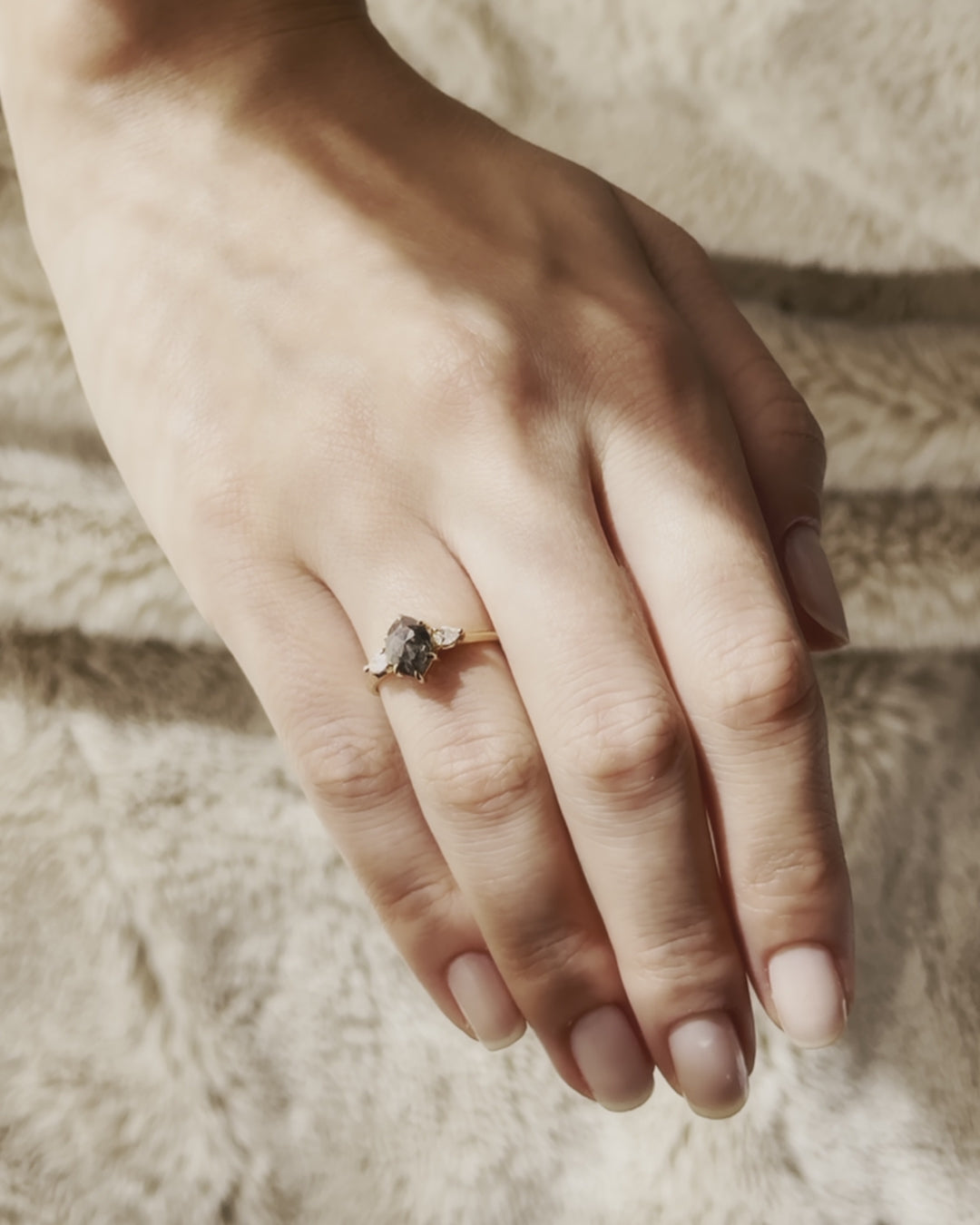 The Eden ring features a large, rare marquise-cut natural gray diamond with dark and stormy hues. The center stone's beauty marks add depth to its character. Set on an 18K yellow gold band, the main diamond is complemented by pear-shaped white diamonds on either side. This modern Art Deco design combines distinctive elements to create a piece that is both striking and wearable.