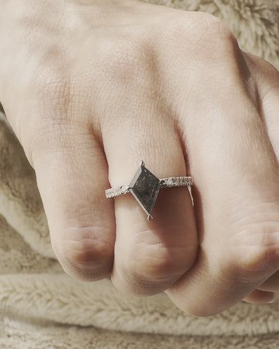 The Enora features a kite-cut salt and pepper diamond in natural black hues as its centerpiece, accompanied by white accent diamonds. Set in an 18K white-gold band, the design draws inspiration from modern art-deco styles. The unique cut and color of the center stone, contrasting with the accent diamonds, create a distinctive look for those seeking an unconventional engagement ring.