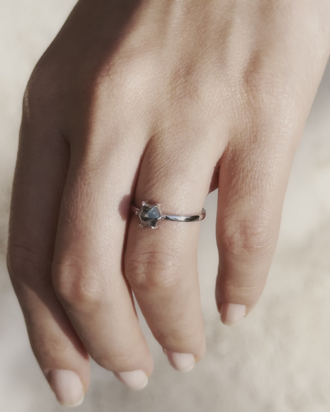 The Gallatin ring features a hexagon-cut salt and pepper diamond set in a modern 18k white gold band. This unconventional center stone showcases unique inclusion patterns that create a captivating depth and texture. The geometric cut of the diamond complements its organic internal landscape, while the contemporary band design provides a sleek backdrop. This ring offers a fresh take on the engagement ring tradition, appealing to those who appreciate both natural beauty and modern aesthetics.