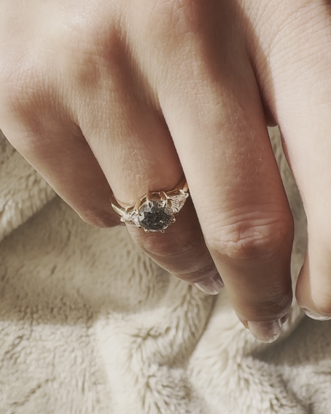 The Hesse ring combines a large, round salt and pepper diamond with rare triangle-shaped white diamond side stones. Crafted in 18K rose gold, its design blends modern aesthetics with Art Deco flair. This salt and pepper diamond engagement ring with triangle side diamonds offers a unique mix of natural gray diamond beauty and architectural elegance, ideal for daily wear. Yellow gold customization available upon request.