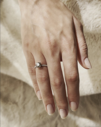 The Ingersoll ring features a 1.51 carat brilliant-cut fancy gray diamond, adorned with white and champagne beauty marks that create a captivating galactic appearance. This galaxy-inspired diamond engagement ring is enhanced by radiant white accent diamonds encircling the center stone, amplifying its cosmic allure. The interplay between the large gray diamond and its sparkling surround offers a celestial-inspired design perfect for those seeking a truly distinctive engagement ring.