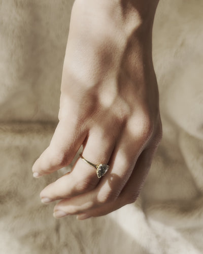 The Isla pear-shaped gray diamond ring features a large, rose-cut stone set in a modern shank with signature claw prongs. Often called salt and pepper or galaxy diamonds due to their unique inclusions resembling cosmic dust, these gray diamonds offer a captivating alternative to traditional clear stones. This modern salt and pepper engagement ring combines contemporary design with the enchantment of a one-of-a-kind celestial-inspired centerpiece.