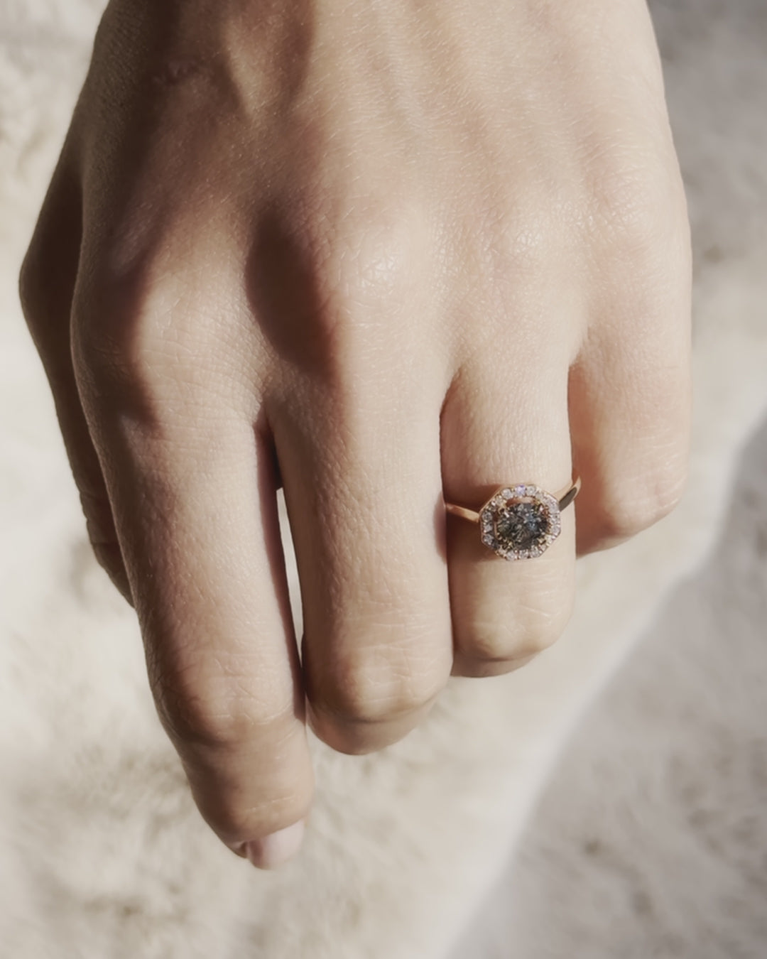 This exquisite engagement ring features a captivating salt and pepper diamond at its center, displaying unique inclusions and natural beauty. An octagonal halo of sparkling round brilliant-cut diamonds surrounds the center stone, enhancing its allure and creating a stunning visual impact. The 18K rose gold band adds a warm and elegant touch to the overall design. The Maxine ring combines a distinctive salt and pepper diamond with a classic halo setting and modern rose gold, resulting in a truly unique and sophisticated piece perfect for those seeking an extraordinary engagement ring.