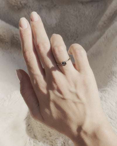 The Serafina ring combines modern elegance with timeless appeal through its striking hexagon-cut green sapphire set in sleek 18K yellow gold. This unique engagement ring showcases a vibrant teal-green sapphire, whose mesmerizing hue is amplified by its precision-cut hexagonal shape. Six prongs securely cradle the gemstone while allowing light to dance through its facets. The refined gold band subtly tapers, complementing the sapphire's geometric form. Serafina offers a contemporary twist on classic sophistication, perfect for those seeking a non-traditional engagement ring that pairs rare beauty with enduring style.